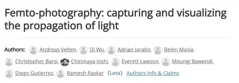 摘要:本文介绍了一种使用单目 RGB 相机进行实时、精确 3D 面部跟踪和动作捕捉的开创性方法,开辟了在移动设备上创建逼真面部动画的方法。 周昆,2002 年获浙江大学工学博士学位,现为浙江大学计算机学院教授、国际计算机学会会士 (ACM Fellow),国际电气电子工程师协会会士 (IEEE Fellow)。 周昆的研究领域为计算机图形学、计算机视觉、人机交互和虚拟现实。在 ACM 和 IEEE 汇刊上发表论文 100 余篇,论文引用 1 万余次,获得发明专利 60 余项。他曾获得 2009 年 NVIDIA Professor Partnership Award、2010 年中国计算机图形学杰出奖、2011 年中国青年科技奖、2011 年麻省理工学院《技术评论》全球杰出青年创新人物奖 (MIT TR35 Award)、2016 年陈嘉庚青年科学奖、2021 年科学探索奖、2022 年亚洲图形学会杰出技术贡献奖。 论文 2:Femto-Photography: Capturing and Visualizing the Propagation of Light (2013)**
