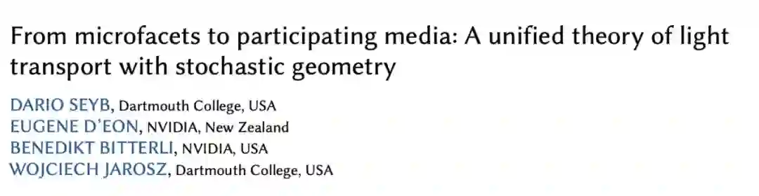 自 50 年前举办第一次会议以来, Technical Papers program 一直是 SIGGRAPH 的核心。众多研究传播和讨论了动画、模拟、成像、几何、建模、渲染、人机交互、触觉、制造、机器人、可视化、音频、光学、编程语言、沉浸式体验和视觉计算机器学习等方面创新学术工作。继 SIGGRAPH 2022 和 SIGGRAPH 2023 之后,SIGGRAPH 2024 继续接收两个综合论文 track 的投稿:期刊(ACM Transactions on Graphics)和会议。其中,每年的最佳论文和荣誉提名奖授予那些「对计算机图形学和交互技术未来研究做出新贡献的突出性研究。」SIGGRAPH 2024 从数百篇投稿论文中评选出了 5 篇最佳论文、12 篇最佳论文荣誉提名以及 4 篇时间检验奖论文。PS:大家熟悉的高斯泼贱就是去年的最佳论文之一。最佳论文及荣誉提名奖论文 1:From Microfacets to Participating Media: A Unified Theory of Light Transport With Stochastic Geometry