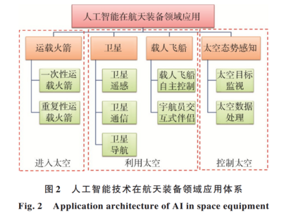 人工智能技术被各主要强国视为“改变游戏规则”的尖端技术之一,有望提升航天装备可靠 性、快速性和自主性,从而产生颠覆性影响。简要分析了人工智能的技术发展态势及其在航天装 备中的应用态势。建立了人工智能在航天装备领域应用体系,并在此基础上,按照进入太空、利用 太空和控制太空的维度,从运载火箭、卫星通信、卫星遥感、卫星导航、载人飞船、太空态势感知等 方面,深入分析了人工智能在航天装备领域的应用场景。最后,归纳了人工智能在航天装备领域 应用的趋势。为我国发展人工智能技术在航天装备领域的应用提供参考。大 数 据 、云 计 算 、人 工 智 能(artificial intelligence,AI)等高新技术促进了航天事业飞速发 展,加速了可回收火箭、智能遥感卫星、新型载人飞 船、太空机器人等一系列新型高科技航天装备落地 应 用 ,初 步 展 现 了 人 工 智 能 技 术 +航 天 的 时 代 雏 形[1-6]。自 2006 年深度学习取得突破以来,人工智 能因可感知或认知外界环境并产生交互,可自我学 习,有望进一步提升航天装备可靠性、快速性及自 主性,实现航天活动能力质的飞跃[7-8] 。人工智能在 航天装备领域的应用,涉及运载火箭、卫星、载人飞 船、太空态势感知装备等方面[9-12]。本文重点讨论 人工智能在军事航天装备领域的应用。世界各主要强国均大力推进航天装备的智能 化战略,人工智能技术在航天装备领域的应用成为 国内外研究热点。Gianluca Furano 重点探讨了人工 智能技术在遥感、导航以及航天器健康监测等航天 装备原位测量中的应用[13]。郝晓龙等分析了智能 航天体系的概念内涵及架构[14] 。然而,当前研究大 多从航天装备的某几个具体应用点展开讨论,从进 入太空、利用太空、控制太空维度,系统全面分析人 工智能在航天装备领域应用的较少。本文在简要分析航天装备领域对人工智能技 术需求、人工智能技术发展态势以及人工智能航天 装备应用发展态势的基础上,对应进入/利用/控制 太空,从运载火箭、卫星遥感、卫星通信、载人飞船、 太空态势感知等方面,系统研究人工智能在航天装 备领域应用场景,探讨人工智能在航天装备领域应 用发展趋势。