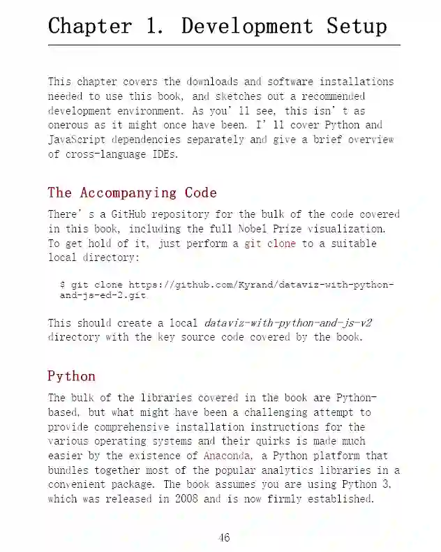 Python提供了可访问的、强大的、成熟的库来抓取、清理和处理数据。虽然JavaScript是web可视化编程的最佳语言,但它的数据处理能力无法与Python相比。总之,这两种语言是创建现代web可视化工具链的完美补充。这本书能让你入门。
