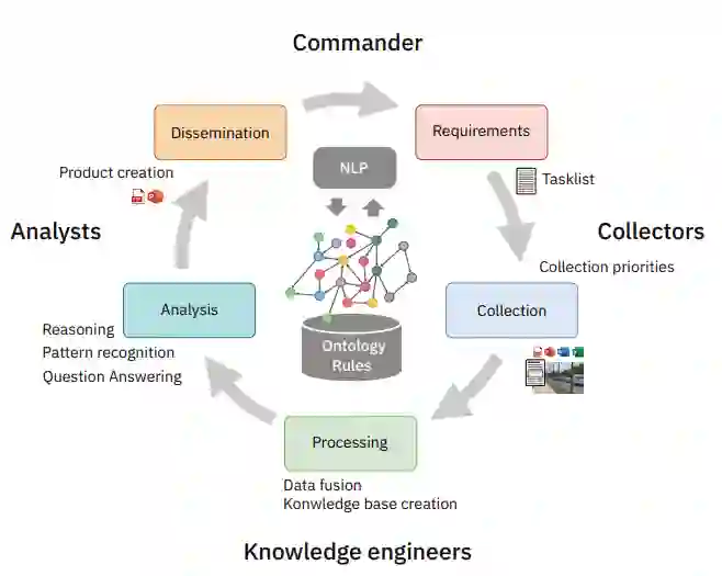 图1:情报周期内的知识工程流程。传统情报周期通常由需求模块起始的四个组件构成。新增的"处理"模块通常作为分析模块的子流程。此处将其视为独立模块,旨在突显周期内两个底层流程:一级数据处理与融合阶段,二级高级情报生成阶段。
