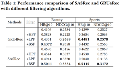 我们首先制作了简易的高通(HPF)、低通(LPF)、带阻(BSF)三种不同类型的滤波器,放置于GRU4Rec(基于RNN)和SASRec(基于Transformer)模型的Embedding层与Encoder层之间,不对其它部分做任何改动,在不同数据集上进行训练,表现大致相同并且结果令我们惊喜,表1中列出了在Beauty和Sports数据集上的结果,可以清楚地看到低通滤波器、带阻滤波器给GRU4Rec、SASRec的性能带来了持续且显著的提升。