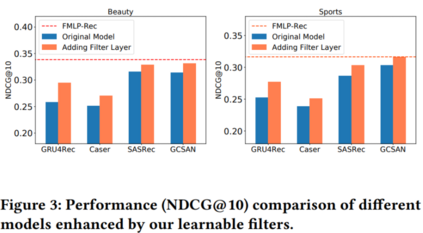 我们还设计了实验来证明在FMLP-Rec中起关键作用的滤波器层有望作为一个通用的网络模块,添加到其他模型中来处理序列化推荐任务,来提升这些模型的性能。于是,我们分别选取了基于RNN的GRU4Rec、基于CNN的Caser、基于GNN的GCSAN和基于Transformer的SASRec作为基准模型,然后将可学习的滤波器层添加到这些模型的Embedding层和Encoder层之间,在不同数据集中进行训练,与原始模型的结果对比见下图。可以看出,在加入可学习的滤波器层之后,所有模型的的表现都超过了原始模型,证明了滤波器层的加入能够明显减弱这些神经网络受噪音影响的现象,但是另一方面,这些加入了滤波器层之后的模型依旧没能比我们的FMLP-Rec表现更好,这表明可学习的滤波器层与参数更少的MLP结构的组合是更适用于序列化推荐任务的。