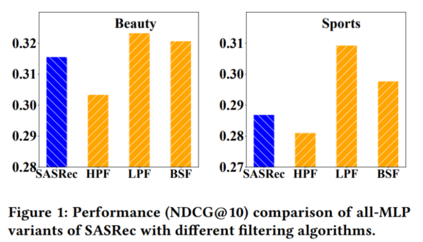 我们更进一步将SASRec中的多头自注意力机制(mutil-head self-attention)换为之前用到的三种滤波器,这样得到的模型就是一个全MLP模型。我们将这种模型与SASRec在相同的数据集上进行测试,结果对比见图1。不难看出,结构简易的、添加了低通滤波器的MLP模型,在性能上大幅超越了设计复杂的、基于自注意力机制SASRec模型,这表明合适的滤波器与全MLP模型的组合是十分适用于序列化推荐领域的,这种组合能够在保持模型轻量化的同时,降低信号噪音,有效减弱过拟合现象。