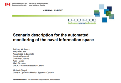 达尔豪西大学大数据分析研究所、加拿大国防研究与发展研究所 (DRDC) – 大西洋研究中心和加拿大通用动力任务系统 (GDMS-C) 成功向加拿大自然科学与工程研究委员会 (NSERC) 提出申请, 促成了一个为期三年的资助项目,名为自动监控海军信息空间 (AMNIS)。 AMNIS 启动会议于 2020 年 10 月 14 日举行,众多教授、国防科学家和 GDMS-C 技术人员参加了会议。会议确定了三个组织的多项行动。与 DRDC 和 GDMS-C 相关的一项行动是需要与任务相关的情景来帮助指导预期的研究。因此,DRDC 率先描述了一个具有代表性的海陆情景,这将使研究人员能够更好地了解与 AMNIS 相关的潜在研究途径。开发的场景涉及由加拿大皇家海军 (RCN) 和加拿大陆军 (CA) 执行的加拿大人道主义任务。任务是向最近遭受自然灾害袭击的国家分发食品和医疗用品。敌对势力也试图窃取物资。该场景描述了通过更好的处理技术和决策来改进信息流、共享和使用的需求。该方案旨在引发进一步的讨论并帮助巩固 AMNIS 参与者的研究主题。