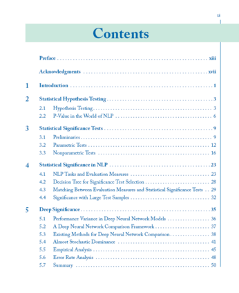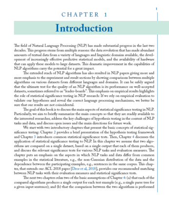 本书的目标是讨论NLP中统计显著性检验的主要方面。我们贯穿全书的指导假设是,NLP研究人员和工程师要处理的基本问题是,一种算法是否可以被认为比另一种算法更好。这个问题推动了这个领域的发展,因为它允许不断发展更好的技术来应对语言处理的挑战。在实践中,研究人员和工程师希望从一组有限的实验中得出正确的结论,这一结论应该适用于其他使用他们没有可用数据集的实验,或由于时间和资源有限而无法执行的实验。因此,本书从两种算法的实验比较的角度讨论了在自然语言处理中使用统计显著性检验的机遇和挑战。我们涵盖的主题包括为主要的NLP任务选择合适的显著性检验,处理非凸深度神经网络显著性检验的独特方面,以统计有效的方式在两种NLP算法之间进行大量的比较(多重假设检验),最后,数据和现场实践的性质带来了独特的挑战。
