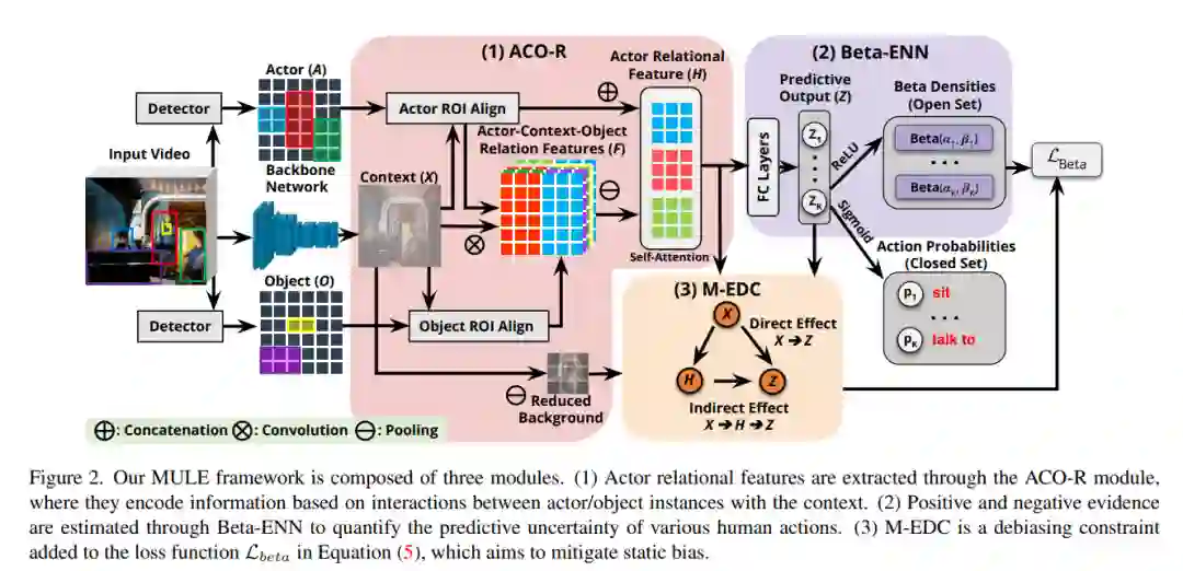 现有的开放集动作识别方法主要集中在新奇度检测上,假设视频片段显示单个动作,这在现实世界中是不现实的。本文提出一种基于多标签证据学习(MULE)的开放集动作识别和新奇检测的新方法,通过解决同一场景中单个或多个参与者同时进行动作的更一般的问题,超越了之前的新动作检测方法。Beta证据神经网络基于actorcontext-object关系表示,用Beta密度估计多动作的不确定性。在目标函数中添加了证据去偏约束进行优化,以减少视频表示的静态偏差,这可能会错误地将预测和静态线索关联起来。我们开发了一种基于原始对偶平均方案更新的学习算法来优化所提出的问题。优化算法的理论分析证明了原始解序列的收敛性以及损失函数和去偏约束的界。提出了基于不确定性和信念的新奇度估计机制来检测新动作。在两个真实的视频数据集上的广泛实验表明,所提出的方法在单/多角色、单/多动作设置中取得了很好的性能。