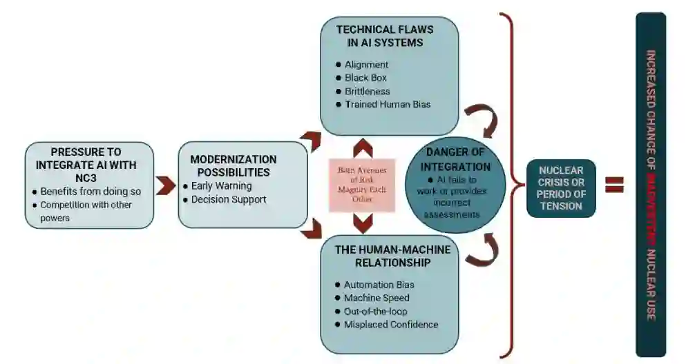 下图展示了从人工智能/机器学习系统与核指挥与控制的整合到增加核武器使用风险的一般路径。