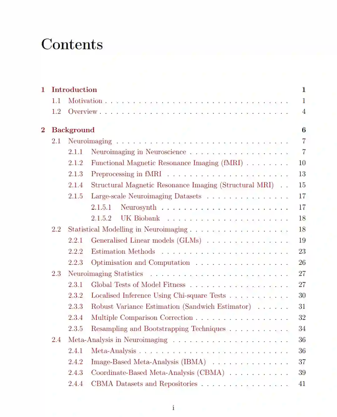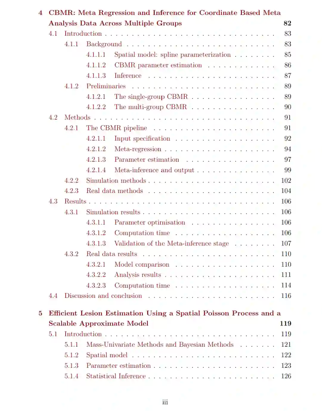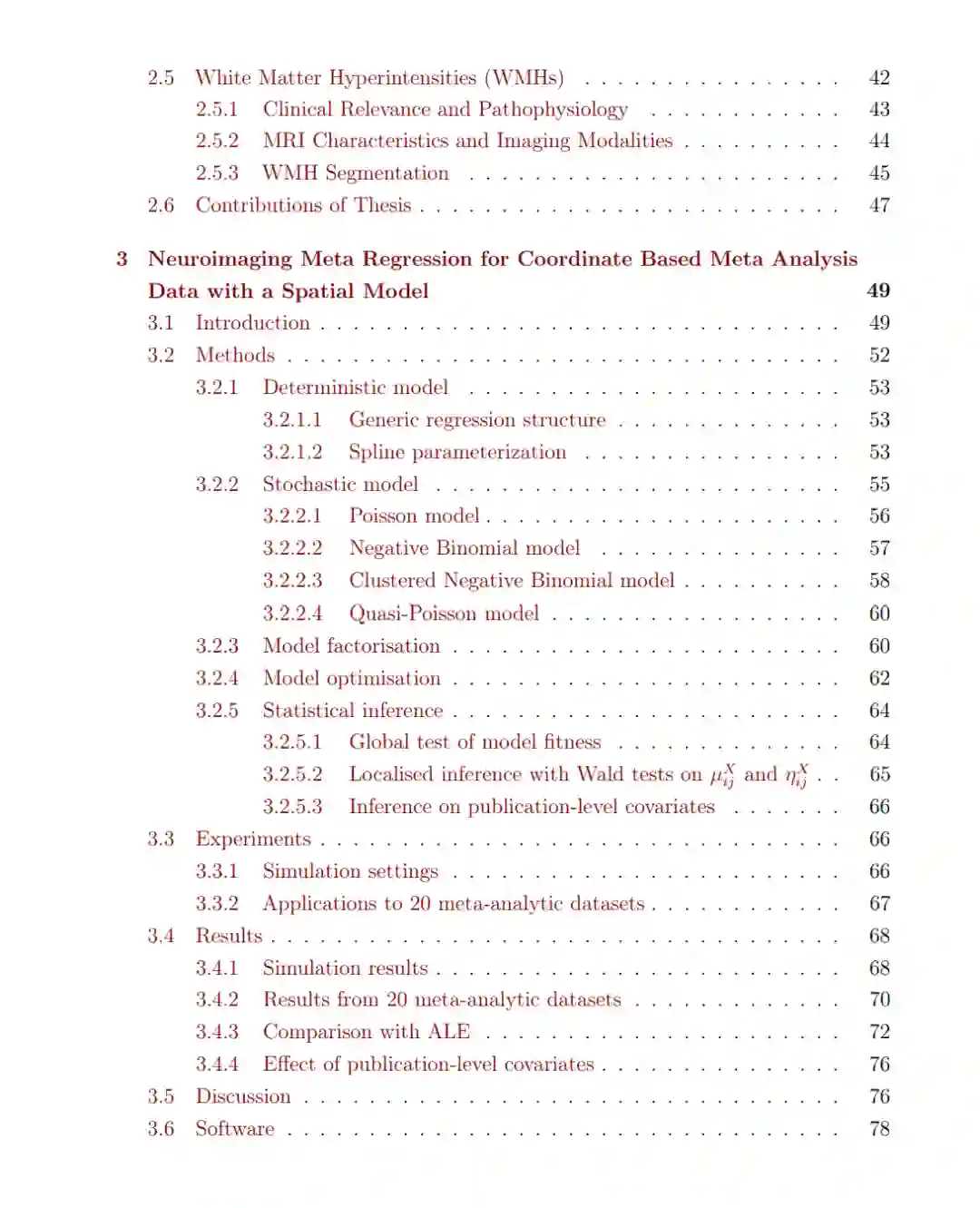 神经影像技术(如功能性磁共振成像 fMRI 和结构性磁共振成像 sMRI)已成为理解人脑功能与病理过程的关键工具。fMRI 通过测量血氧水平依赖(BOLD)信号,使研究者能够识别与特定认知和行为过程相关的大脑区域;结构性 MRI 则提供高分辨率的大脑解剖结构图谱,使我们能够识别形态变化(如白质病灶),从而加深对神经退行性疾病与脑血管疾病的理解。 尽管近年来在数据共享与大规模神经影像队列可获取性方面取得了显著进展,但仍存在若干普遍的分析挑战。个体神经影像研究往往样本量有限,这限制了统计功效并削弱了研究结果的泛化能力。许多现有的分析方法难以在模型复杂度、可解释性与可扩展性之间实现良好平衡。另一个关键限制是缺乏能够在保持计算效率的同时,显式建模神经影像数据中空间依赖结构的方法。解决这些挑战对于提升神经影像研究的可靠性、可重复性及其临床相关性具有重要意义。 本论文旨在通过构建统计方法,显式建模神经影像数据中的空间依赖性,同时确保计算效率与良好的可扩展性,以应对上述挑战。所提出的方法框架基于广义线性模型(GLMs),通过样条函数参数化或高斯核引入空间建模模块。这些模型能够灵活地适配全局常数或空间变异的协变量,在回归框架下支持概率或强度的估计,并能够开展灵活的体素级统计检验,如空间齐性检验与组间比较。 为了应对大规模神经影像数据所带来的计算挑战,论文还引入了若干降维与效率优化策略,包括模型因式分解、并行计算及内存优化算法。此外,还探讨了稳健而准确的推断方法,如基于 sandwich 估计量的标准误估计,以及基于自助法(bootstrap)的非参数推断方法。 本文所提出的方法被应用于两个具有代表性的神经影像任务,验证其可解释性、可扩展性与鲁棒性:(1)基于坐标的元分析(CBMA),用于整合任务驱动或刺激驱动的 fMRI 研究;(2)基于 T2 加权 MRI 数据的脑病灶概率估计,以及风险因子的空间异质性效应推断。 在 CBMA 场景中,所提出的模型能够更准确且空间上更平滑地近似激活强度函数,并支持系统性分析可能的变异来源。该框架还被进一步扩展以支持多组比较,使得可以对不同组之间的激活模式差异进行推断。 在脑病灶图谱构建任务中,本文采用类似的建模原则,以估计临床风险因子(如年龄与心血管状况)在全脑范围内对病灶分布的体素级影响。
