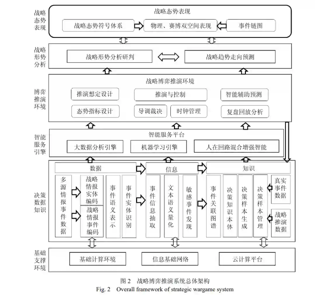 战略博弈推演是战略决策的重要手段。剖析了战略博弈推演研究现状及面临的挑战,分析了大数据、人工智能技术对战略博弈推演系统建设带来的启示,研究提出下一代战略博弈推演系统发展设想以及需要突破的关键技术,即面向战略主题的事件关联图谱构建、基于生成对抗网络的战略决策稀疏样本生成、人在回路混合增强博弈策略学习及基于社交网络的舆情传播建模技术。在此基础上,对未来战略博弈推演的发展趋势进行了展望。 大国竞争时代,战略层面的博弈对抗不仅是军 事力量之间的较量,更是国家体系之间的整体对 抗,需要综合运用政治、军事、经济、外交、舆论 等各种手段来实现国家利益和政治目的。然而,人 类面对复杂情况的应变和处理能力有限,在实际的 策略选择和方案制定上,需要先进行可行性分析和 结果推演,起到评估和发现漏洞的作用,帮助决策 者提高决策的效率。因此,在面对重大危机事件时, 运用战略博弈推演研究战略问题,形成更为合理的 战略决策成为必然。美军历来推崇“无推演,不决 策”,可见战略博弈推演的重要性和必要性。 当前,大数据和人工智能技术加速运用于战略 问题研究,战略博弈推演的智能化特征凸显。杨镜 宇等[1]提出面向事件认知的战略博弈系统设计理 念,基于海量情报大数据挖掘分析事件演化规律, 进而支撑战略形势研判,并将强化学习应用于战略 趋势预测。本文在此基础上,研究探讨由此带来的下一代战略博弈推演系统发展设想及需要突破 的关键技术,为战略博弈推演创新提供有益借鉴。