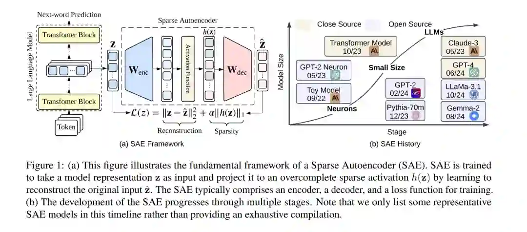 大型语言模型(Large Language Models,LLMs),如 GPT-4、Claude-3.5、DeepSeek-R1 和 Grok-3,已成为自然语言处理领域中极具影响力的工具,在文本生成、复杂推理等多种任务上展现出卓越能力。然而,随着模型规模和结构复杂度的不断提升,理解其内部表征与决策过程正变得愈发困难。大语言模型所呈现出的这种“黑箱”特性,促使研究界对机制可解释性(mechanistic interpretability)产生了日益浓厚的兴趣。该研究方向旨在将大语言模型拆解为可理解的组成部分,并系统性地分析这些组成部分之间的相互作用,从而揭示模型行为的内在机理。 在众多用于解释大语言模型的方法中,稀疏自编码器(Sparse Autoencoders,SAEs)逐渐成为一条尤为有前景的研究路线,尤其在应对大语言模型可解释性中的一个核心挑战——多语义性(polysemanticity)方面表现突出。大语言模型中的许多神经元往往同时对多个看似无关的概念或特征作出响应,这种现象被称为多语义性。其成因通常被认为与叠加表示(superposition)有关,即模型通过将多个独立特征以线性组合的方式编码到有限数量的神经元中,从而在神经元数量受限的情况下表示更多特征。 稀疏自编码器通过学习一种过完备且稀疏的激活表示,为缓解这一问题提供了有效途径。具体而言,SAE 在重构目标网络某一层激活的同时引入稀疏性约束,从而将原本叠加在一起的特征解耦为更具可解释性的表示单元。借助这种方式,SAE 能够从模型激活中提取出数量更多、语义更为单一(monosemantic)的特征,为理解大语言模型正在处理的信息提供更清晰的视角。已有研究表明,该方法有望将原本难以理解的激活空间转化为更加符合人类直觉的表示形式,从而为复杂模型的机制分析提供一种更为有效的“解释词汇”。