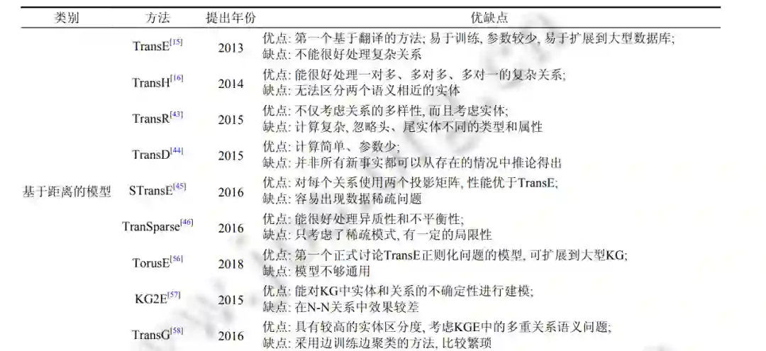 基于距离的模型使用基于距离的评分函数, 即通过计算实体之间的距离来衡量事实的合理性, 在这种情况下, 翻译原理 h+r≈th+r≈t 被广泛使用. 也就是说, 基于距离的模型通常由关系执行翻译后, 根据两个实体之间的距离来度量一个事实的合理性. 本小节将基于距离的模型进一步细分为基本距离模型, 翻译模型和复杂关系建模. 下图基于距离的模型进行了全面总结.