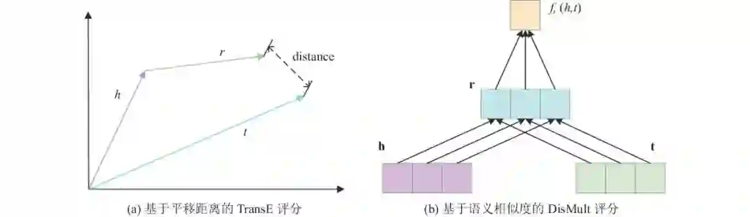 本节对仅使用事实进行知识图谱嵌入的方法采用评分函数进行划分. 评分函数用于衡量事实的合理性, 在基于能量的学习框架中也被称为能量函数. 典型类型的评分函数分为两种: 基于距离的评分函数(如图1(a))与基于相似性的评分函数(如图1(b)).