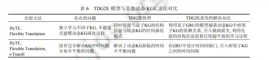 当前KGE的研究主要集中于静态知识图谱, 其中事实不会随时间发生变化, 例如: TransE, TransH, TransR, RESCAL等. 但是, 在实际应用中, 知识图谱通常是动态的, 例如Twitter中的社交知识图, DBLP中的引文知识图等, 其中事实随时间演变, 仅在特定时间段内有效. 以往的静态KGE方法完全忽略了时间信息, 这使得静态KGE方法无法在这些实际场景中工作. 因此, 有必要设计一种用于动态知识图谱嵌入的方法. 本节介绍了典型的动态知识图谱嵌入方法, 其中分析了t-TransE, Know-Evolve, HyTE, TDG2E等相关模型, 表6将TDG2E模型与其他动态KGE方法进行对比, 直观地展示了TDG2E方法的优越性. 然而, 从大量文献中可以得出结论: 现有的大多数知识图谱嵌入方法仍然关注于静态知识图谱, 忽略了知识图谱中时间范围信息的可用性与重要性. 实际上, 在表示学习过程中合并时间信息可能会产生更好的KG嵌入, 时间感知的知识图谱嵌入研究仍然是一个有待于进一步探索的领域.
