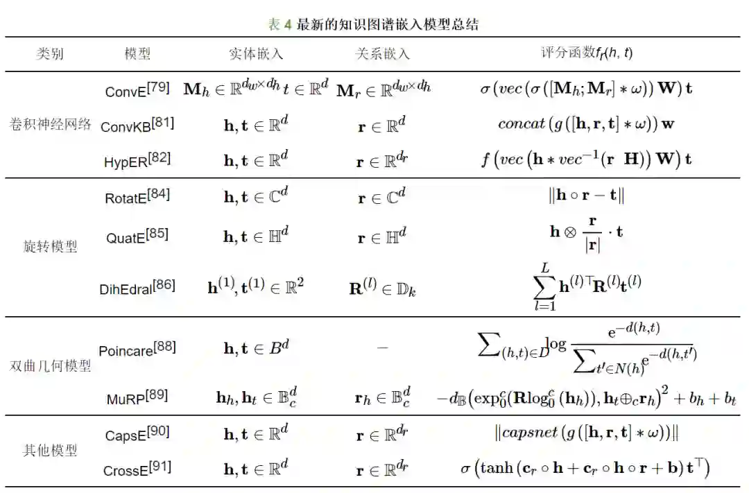 最新的知识图谱嵌入模型 大多数翻译模型和双线性模型是2016年之前提出的方法, 而最近几年研究KGE的方法众多. 本小节简要介绍其中的主流方法, 具体划分为卷积神经网络模型, 旋转模型, 双曲几何模型和其他模型.
