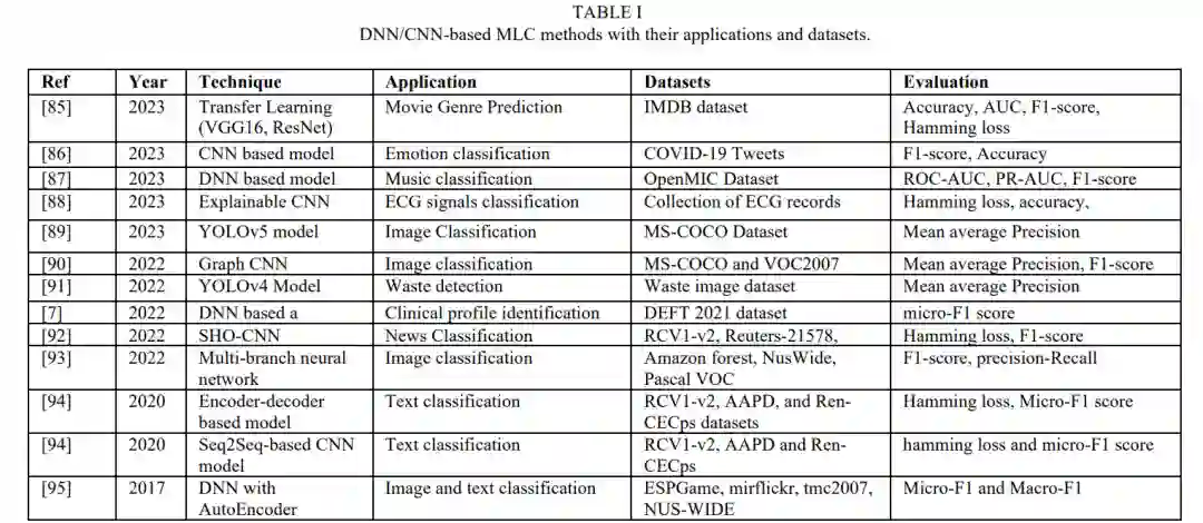 据作者所知,本综述是第一个全面覆盖用于解决MLC任务的DL方法的,涵盖了多种领域和数据模态,包括文本、音乐、图像和视频。