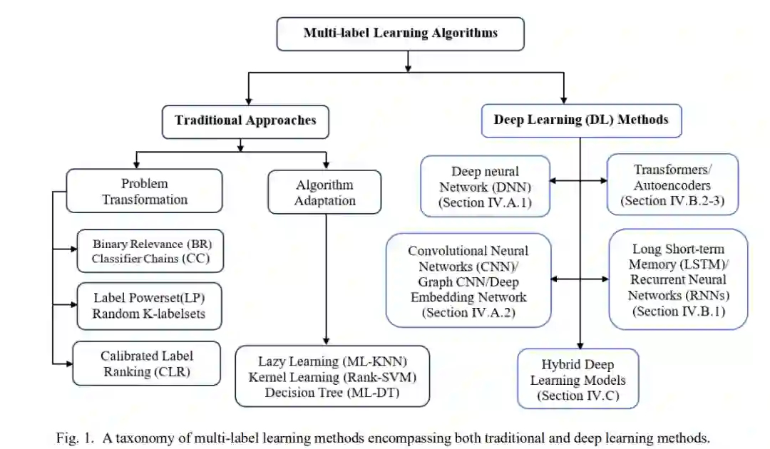 除了传统方法外,深度学习(DL)技术在解决MLC挑战中越来越受欢迎。深度学习的强大学习能力特别适用于解决MLC挑战,这通过它们在解决单标签分类任务中的显著成功得到了证明。目前,MLC中的一个主要趋势是广泛地结合DL技术,即使是对于更具挑战性的问题,如极端MLC【24】【25】【26】、不平衡MLC【27】【28】、弱监督MLC【29】【30】【31】和缺失标签的MLC【32】【33】。有效地利用DL的强大学习能力对于更好地理解和建模标签相关性至关重要,从而使DL能够有效地解决MLC问题。一些研究表明,专门设计用于捕获标签依赖性的MLC方法通常展示出更优越的预测性能【34】【19】。本文对现有文献进行了简要回顾,旨在识别一系列基于DL的技术用于MLC问题,以激发对MLC的创新DL基方法的进一步探索。已有一些关于MLC传统方法的综述,如在【35】【23】【36】中引用的那些。此外,还有一些综述包含了传统方法和DL方法【37】【38】,但这些综述对MLC的DL方法的覆盖有限,并且集中在特定领域。然而,本文独特地关注于一系列DL架构,包括循环和卷积网络、变换器、自编码器和混合模型,用于解决多个领域中的MLC挑战。在图1中,我们提出了一个包含传统方法和DL方法的多标签学习方法的分类。