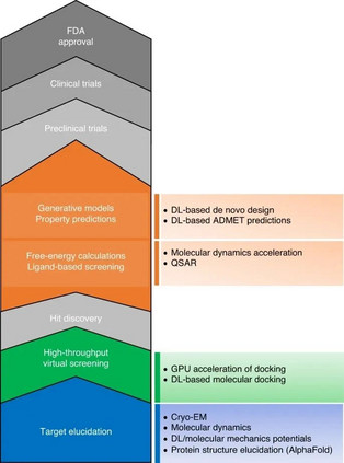 生物信息学、化学信息学和化学基因组学领域,包括计算机辅助药物发现 (CADD),已经利用了在GPU上运行的DL方法。CADD中的大多数挑战通常都面临着组合学和优化问题,而机器学习已经有效地提供了解决方案。因此,CADD应用中的DL已经取得了重大进展,如虚拟筛选、新药设计、吸收、分布、代谢、排泄和毒性 (ADMET) 特性预测等等 (图1)。