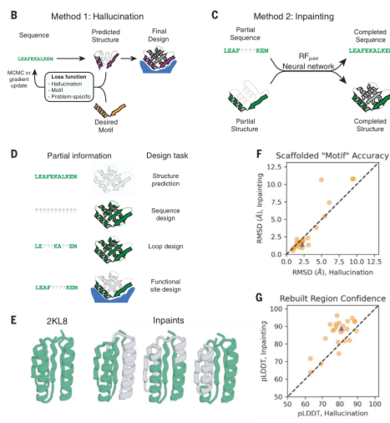 第二种被称为**“ Inpainting”(修复,蛋白质修复):即将特定的序列/活性位点输入到软件(RoseTTAFold神经网络)中,软件可以在几秒内填补蛋白质结构的缺失部分,类似于使用语言模型补全给定的几个单词,该方法将蛋白质设计简化为信息缺失—恢复问题。**