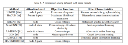 在深度图模型中,节点邻居的权重被定义为相等或默认设置。然而,邻居的重要性往往因属性和结构特征的不同而不同。受注意力机制的启发,Velivckovic等人[92]将注意力机制应用于GCN的空间卷积操作,提出了一种图注意力网络(GAT)。图4展示了注意力机制如何应用于网络欺凌检测的一个简单示例。在本节中,我们总结并介绍了使用图注意力网络的异常分析算法。该方法按照异常类型分为2个子检测,即节点异常检测和(子)图异常检测。表4总结了这些方法的主要特征。