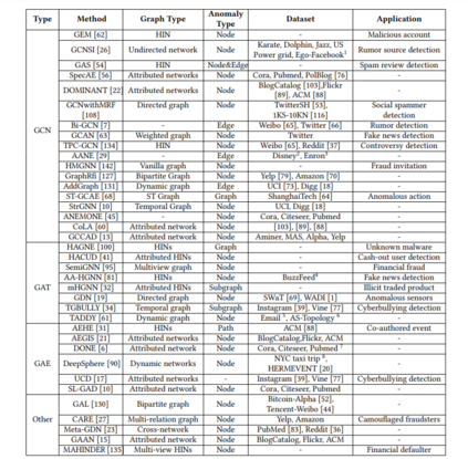 异构异常类。图中节点和链接的类型通常不统一,导致异质信息网络(heterogeneous information networks, HINs)的出现。HINs通常包含实体和关系之间更复杂的信息,特别是那些包含不同模态的信息[85],这对于识别特定图中不同类型的异常非常重要。