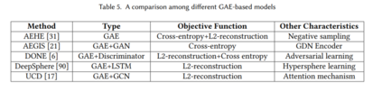 图自动编码器(GAE)是一种用于生成低维表示的无监督结构,目的是最小化编码器的输入和解码器的输出之间的损失[91]。在本节中,我们将介绍应用于异常分析的基于GAE的算法。根据训练和学习模式的不同,将这些方法分为3类,即通用自编码器、对抗训练和超球学习。表5总结了这些方法的主要特点。在图5中,我们提出了一个基于GAE的异质网络异常引用行为检测模型