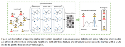 作为深度图模型中最流行的结构,图卷积网络(graph Convolutional Networks, GCNs)可以通过卷积操作学习和生成节点嵌入,即从节点的局部邻域聚合信息的过程。在本节中,我们介绍基于GCN的异常检测和预测方法,这也是所有异常分析模型中最流行的模型类型。根据方法是否针对特定异常检测任务设计,将其分为两类,即通用模型和任务驱动模型。图3展示了如何使用空间卷积操作检测社交网络中的异常用户的玩具模型。表3总结了这些方法的主要特点。