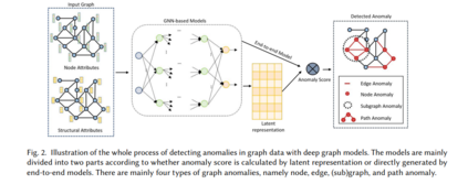 不同类型的异常。研究人员探索了几种类型的异常,如节点、边、子图和路径(如图2所示)。节点异常是指在整个图中与其他节点相比表现出异常行为的实体,例如在社交网络中传播假新闻的用户。其他类型的异常也有类似的概念和它们自己的实际应用。在这种情况下,子图异常难以检测,因为从异常子图中抽取出的子图节点可能表现出正常的行为。