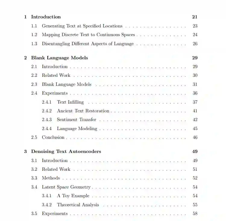 接下来,我们研究文本自动编码器及其通过潜在空间操作控制生成的用途。我们建立了一个理论,如何塑造一个有意义的潜在空间几何离散文本数据。在此基础上,我们开发了一系列去噪文本自动编码器,通过简单的矢量算法展示了属性修改(例如,时态,情感等)的潜力。