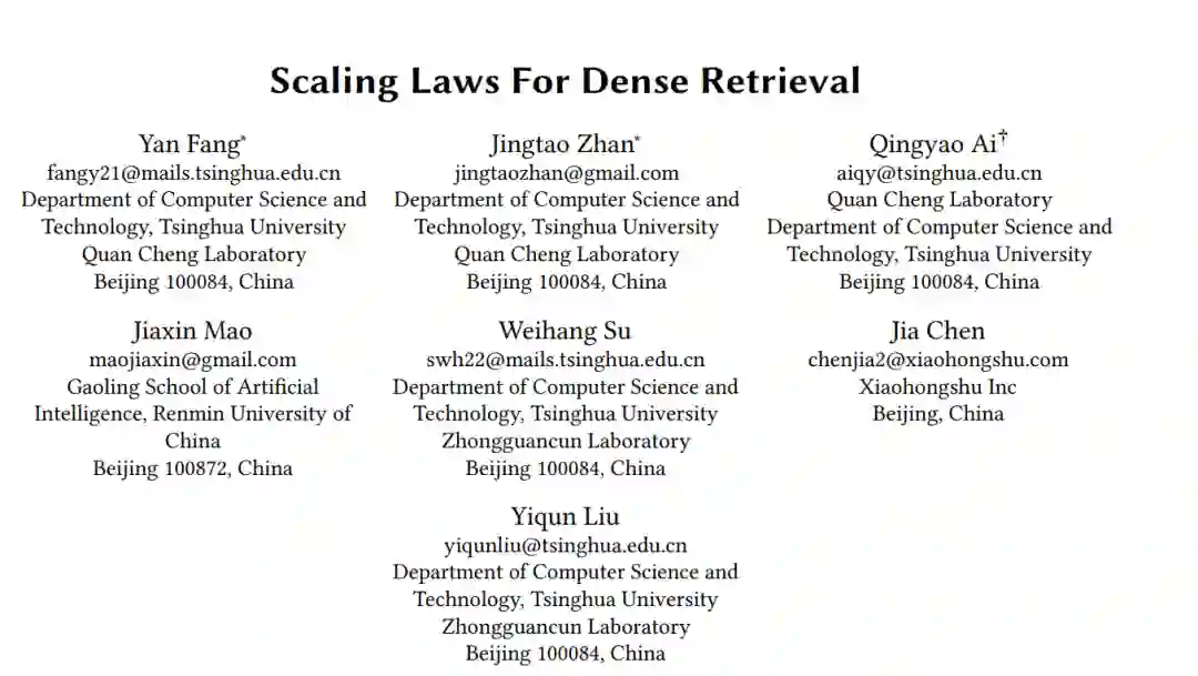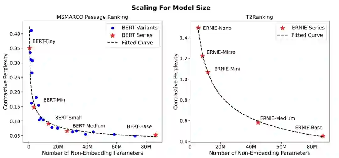 扩展神经模型在广泛的任务中取得了重大进展,特别是在语言生成方面。以前的研究发现,神经模型的性能经常遵循可预测的扩展定律(Scaling Law),与训练集大小和模型大小等因素相关。这种发现在大规模实验成本越来越高的情况下很有价值。然而,由于检索指标的离散性质以及训练数据和模型大小在检索任务中的复杂关系,这种扩展定律在稠密向量检索中尚未得到充分探索。