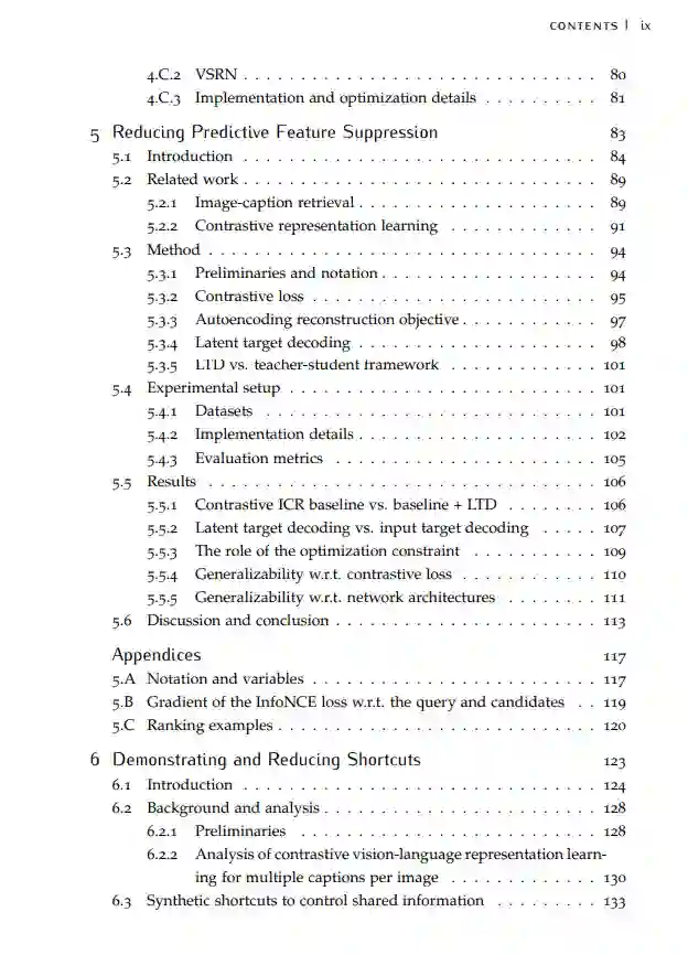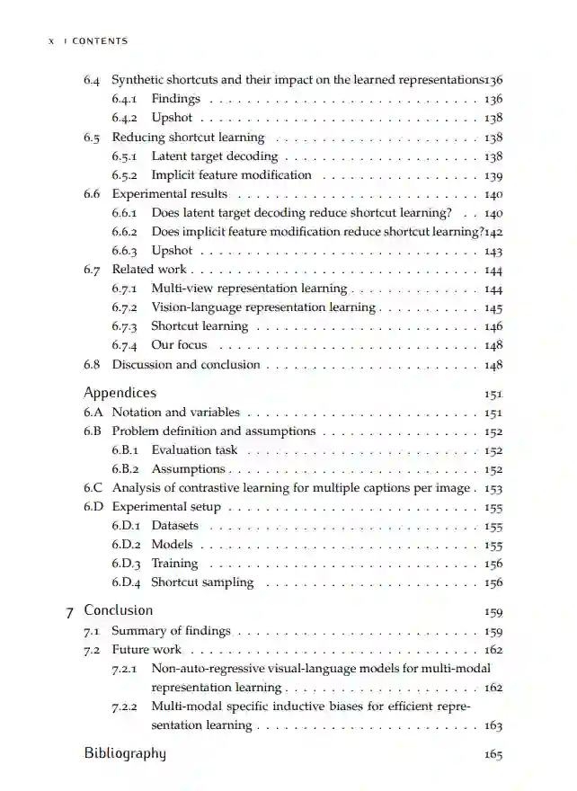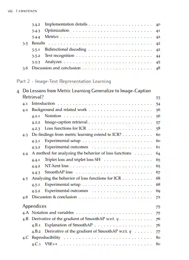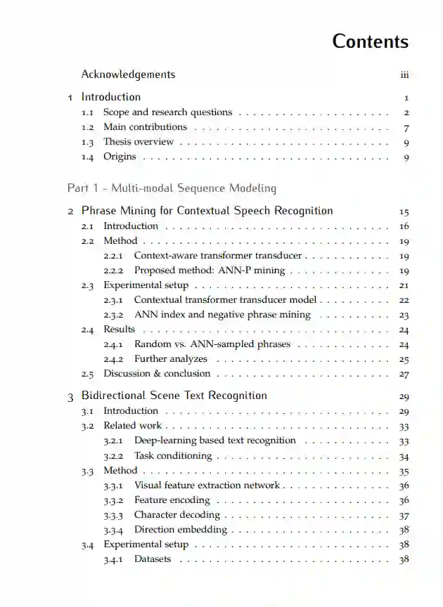 在人工智能(AI)研究的早期阶段,领域内的各个子任务主要是孤立研究的。例如,针对依赖不同数据模态的不同任务开发了不同的方法和理论,如自动语音识别(例如,Graves et al., 2006; Graves, 2012; Hannun et al., 2014),计算机视觉(例如,Krizhevsky et al., 2012; Simonyan and Zisserman, 2015; He et al., 2016),信息检索(例如,Manning et al., 2008; Guo et al., 2016),知识表示(例如,van Harmelen et al., 2008)和自然语言处理(例如,Mikolov et al., 2013; Sutskever et al., 2014; Bahdanau et al., 2015)。仅依靠单一模态,机器不太可能完全理解一个学习问题。例如,人类认知在处理各种任务和问题上表现良好(Noyes et al., 2004),显然不能被视为单模态(Barsalou, 2001)。因此,在本论文中,我们偏离传统的单模态AI方法,转而关注多模态学习问题和算法。多模态AI定义为包含多种数据模态的AI研究问题,如音频(语音)、图像/视频(视觉)和文本(语言)(Baltrusaitis et al., 2019)。 与单模态AI方法相比,利用多模态有几个好处。例如:(i)多模态提供了更丰富的训练信号,因为它从不同的角度描绘了一个数据点,从而增加了互补信息(Guo et al., 2019b)。(ii)多模态AI方法能够处理多种模态的数据,从而实现对内容和学习问题的更全面理解(Gautam, 2023)。 本论文的每一章都聚焦于一个多模态学习问题。贯穿整个论文,我们处理三种模态:(i)音频,(ii)图像,(iii)文本。这三种模态通过三个多模态任务来研究:(i)自动语音识别,(ii)场景文本识别,(iii)图像-标题检索(或更广泛的图像-文本表示学习)。前两个任务的特点是其序列性(即序列建模任务),而后者被定义为多模态表示学习任务。 由于本论文研究的任务特性明显不同,我们将论文分为两部分。在第一部分中,我们关注多模态序列建模。序列建模任务的特点是输入数据的序列性质(如文本或音频)或模型对序列输出进行预测或生成的能力。我们介绍了两种用于多模态序列建模的新方法:一种用于上下文自动语音识别(第2章),一种用于场景文本识别(第3章)。在第二部分中,我们关注图像和文本两种模态的多模态表示学习。表示学习旨在学习输入数据的表示,以便在构建分类器或其他预测器时更容易提取有用信息(Bengio et al., 2013)。图像-文本表示学习的目标是学习图像和文本的通用表示,使视觉概念和文本信息能够相互关联。主要关注的是对比图像-文本表示学习,我们在理解和改进对比图像-文本方法方面提供了新的见解(第4章,第5章和第6章)。