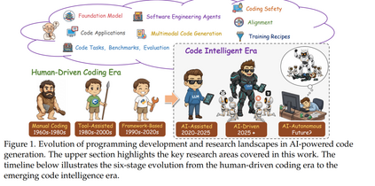 大型语言模型(Large Language Models,LLMs)[66, 67, 192, 424, 435, 750, 753, 755, 756] 的出现引发了自动化软件开发领域的范式转变,从根本上重塑了人类意图与可执行代码之间的关系 [1306]。现代 LLM 在多种代码相关任务中展现出卓越能力,包括代码补全 [98]、代码翻译 [1158]、代码修复 [619, 970] 以及代码生成 [139, 161]。这些模型有效地将多年积累的编程经验提炼为可遵循指令的通用工具,使不同技能水平的开发者都能够基于 GitHub、Stack Overflow 及其他代码相关网站中的数据进行使用和部署。 在众多 LLM 相关任务中,代码生成无疑是最具变革性的方向之一。它使自然语言描述能够直接转化为可运行的源代码,从而消解了领域知识与技术实现之间的传统壁垒。这一能力已不再局限于学术研究,而是通过一系列商业化与开源工具成为现实,包括:(1) GitHub Copilot(Microsoft)[321],在集成开发环境中提供智能代码补全;(2) Cursor(Anysphere)[68],一款支持对话式编程的 AI 原生代码编辑器;(3) CodeGeeX(智谱 AI)[24],支持多语言代码生成;(4) CodeWhisperer(Amazon)[50],与 AWS 服务深度集成;以及 (5) Claude Code(Anthropic)[194] / Gemini CLI(Google)[335],二者均为命令行工具,允许开发者直接在终端中将编码任务委托给 Claude 或 Gemini [67, 955],以支持智能体化(agentic)的编码工作流。这些应用正在重塑软件开发流程,挑战关于编程生产力的传统认知,并重新界定人类创造力与机器辅助之间的边界。 如图 1 所示,代码生成技术的演进轨迹揭示了一条清晰的技术成熟与范式变迁路径。早期方法受限于启发式规则和基于概率文法的框架 [42, 203, 451],在本质上较为脆弱,仅适用于狭窄领域,且难以泛化到多样化的编程场景。Transformer 架构的出现 [291, 361] 并非简单的性能提升,而是对问题空间的根本性重构:通过注意力机制 [997] 与大规模训练,这类模型能够捕获自然语言意图与代码结构之间的复杂关联。更为引人注目的是,这些模型展现出了涌现式的指令遵循能力,这一能力并非显式编程或直接优化的目标,而更像是规模化学习丰富表征的自然结果。这种通过自然语言使非专业用户也能生成复杂程序的“编程民主化”趋势 [138, 864],对 21 世纪的劳动力结构、创新速度以及计算素养的本质产生了深远影响 [223, 904]。 当前代码 LLM 的研究与应用格局呈现出一种通用模型与专用模型并行发展的双轨结构,二者各具优势与权衡。通用大模型,如 GPT 系列 [747, 750, 753]、Claude 系列 [66, 67, 192] 以及 LLaMA 系列 [690, 691, 979, 980],依托包含自然语言与代码在内的超大规模语料,具备对上下文、意图及领域知识的深度理解能力。相较之下,代码专用大模型(如 StarCoder [563]、Code LLaMA [859]、DeepSeek-Coder [232]、CodeGemma [1295] 和 QwenCoder [435, 825])则通过在编程导向数据上的聚焦式预训练与任务特定的架构优化,在代码基准测试中取得了更优性能。诸如 HumanEval [161] 等标准化基准上从个位数到 95% 以上成功率的跃迁,既体现了算法层面的创新,也反映了对代码与自然语言在组合语义与上下文依赖方面共性的更深刻理解。 尽管相关研究与商业应用发展迅速,现有文献中仍然存在创新广度与系统性分析深度之间的显著鸿沟。现有综述多采取全景式视角,对代码相关任务进行宽泛分类,或聚焦于早期模型阶段,未能对最新进展形成系统整合。尤其值得注意的是,最先进系统所采用的数据构建与筛选策略仍缺乏深入探讨——这些策略在数据规模与数据质量之间进行权衡,并通过指令微调方法使模型行为与开发者意图对齐。相关对齐技术包括引入人类反馈以优化输出、高级提示范式(如思维链推理与小样本学习)、具备多步问题分解能力的自主编码智能体、基于检索增强生成(Retrieval-Augmented Generation, RAG)的事实约束方法,以及超越简单二值正确性、从代码质量、效率与可维护性角度进行评估的新型评价框架。 如图 2 所示,Kimi-K2 [957]、GLM-4.5/4.6 [25, 1248]、Qwen3Coder [825]、Kimi-Dev [1204]、Claude [67]、DeepSeek-V3.2-Exp [234] 以及 GPT-5 [753] 等最新模型集中体现了上述创新方向,但其研究成果分散于不同文献之中,尚缺乏统一、系统的整合。表 1 对多篇与代码智能或 LLM 相关的综述工作进行了比较,从八个维度进行评估:研究领域、是否聚焦代码、是否使用 LLM、是否涉及预训练、监督微调(SFT)、强化学习(RL)、代码 LLM 的训练配方,以及应用场景。这些综述覆盖了通用代码生成、生成式 AI 驱动的软件工程、代码摘要以及基于 LLM 的智能体等多个方向。尽管多数工作关注代码与应用层面,但在技术细节覆盖上差异显著,尤其是强化学习方法在现有综述中鲜有系统讨论。 为此,本文对面向代码智能的大语言模型研究进行了全面而前沿的系统综述,对模型的完整生命周期展开分析,涵盖从初始数据构建、指令调优到高级代码应用与自主编码智能体开发等关键阶段。 为了从代码基础模型出发,系统性地覆盖智能体与应用层面,本文进一步提供了一份贯通理论基础与工程实现的详细实践指南(见表 1)。本文的主要贡献包括: 1. 提出统一的代码 LLM 分类体系,系统梳理其从早期 Transformer 模型到具备涌现式推理能力的指令调优模型的发展脉络; 1. 系统分析从数据构建与预处理、预训练目标与架构创新,到监督指令微调与强化学习等高级微调方法的完整技术流水线; 1. 深入探讨定义当前最优性能的前沿范式,包括提示工