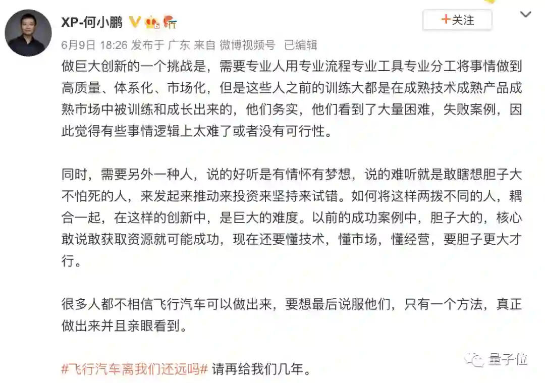 6月9日,小鹏汽车董事长何小鹏在微博上晒出一段飞行汽车的视频。