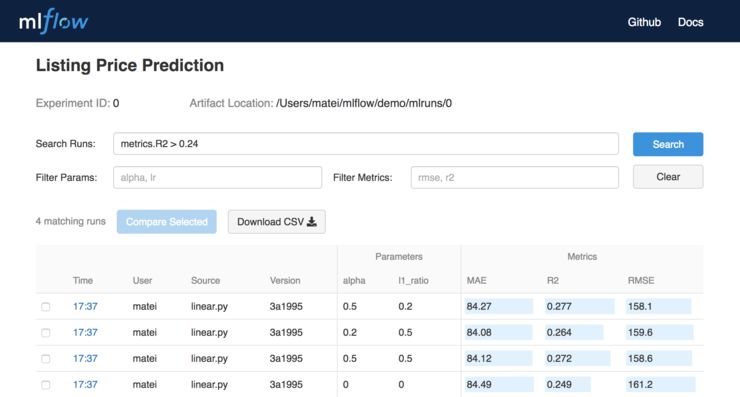你可以在任何环境(独立脚本、notebook 等)下使用 MLflow Tracking 将结果记录到本地文件或者服务器,之后再将多次操作进行对比。借助网页 UI,你可以查看和对比多次输出。团队也能使用这些工具来比较不同用户的实验结果。