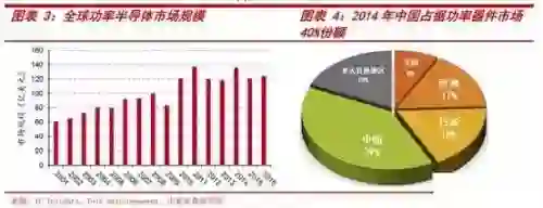 中国功率半导体市场占世界市场的 50% 以上,但在新能源汽车、轨道交通等中高端 MOSFET 及 IGBT 主流器件市场上, 90% 主要依赖进口,基本被国外欧美、日本企业垄断。IGBT 是新能源汽车及充电桩等设备的核心技术器件。据 IHS 预测,到 2020 年全球 IGBT 市场规模可以达到 80 亿美元,年复合增长率约 10%,国内市场规模将超 200 亿元,年复合增长率约为 15%,具备广阔的国产替代空间。