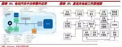 用电端----新能源汽车、充电桩功率半导体器件在新能源汽车和充电桩中应用广泛,内燃机引擎中所使用燃油泵和活塞,正被锂离子电池、逆变器和 IGBT 所取代。据丰田汽车统计,功率半导体器件用量在电动汽车中占到所有半导体器件的 25%。Mosfet、IGBT 等功率模块也是充电桩、充电站等设备的核心电能转换器件。