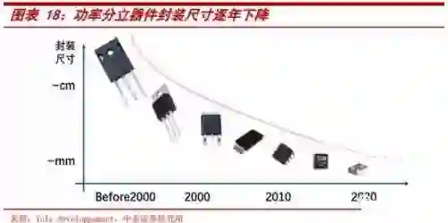 功率分立器件和功率模组的封装工艺演化趋势相同,都是向器件小型化、大功率应用、高能量效率方向进展。