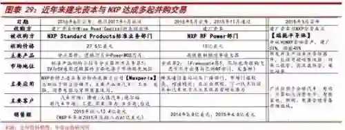 建广收购 NXP 标准部门完成交割,填补国内汽车、工业 IC 空白继 2015 年以 18 亿美元的金额成功收购恩智浦的 RF Power(大功率功放管)部门之后,近日建广资产主导的中国半导体行业最大一笔海外并购案也顺利交割,建广资产以 27.5 亿美元收购恩智浦(NXP)标准件业务,该部门主营业务为分立器件、逻辑芯片和 PowerMOS 芯片等产品。此次收购的顺利完成,标志着建广资本有望成为我国半导体业规模最大且利润最高的 IDM(垂直一体化)企业。