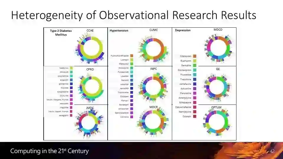 下面这个例子是一个全球性的医疗项目 OHDSI(Observational Health Data Sciences and Informatics),我们看到的是来自25个国家的6亿患者的电子病例数据,都用同样的格式对数据进行收集整理,这些数据令人惊叹,可以使我们深入了解仅靠临床了解不到的医疗情况。