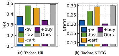 从结果可以看出,+buy 模型总是表现最差,说明了辅助行为对购买预测的重要性。在各个辅助行为中,去除 pv 行为造成了最大的效果衰退,说明了 pv 数据对 MB-GMN 模型的重要性。我们认为这很可能来源于 pv 数据较大的规模,它既可以作为丰富的行为特征数据,也可以为模型学习提供充分的辅助监督信息。