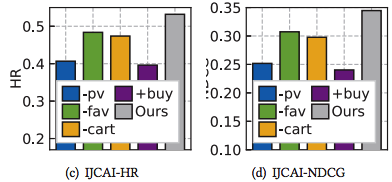 同时,我们针对不同行为类别也进行了消融实验,以探究不同行为类别对模型预测的重要程度。实验结果见下图,其中-代表去除某个行为类别,+buy 代表只保留作为目标行为的购买数据,pv 代表 page view 浏览详情页操作,fav 代表 favorite 收藏操作,cart 代表 add-to-cart 加购物车操作。