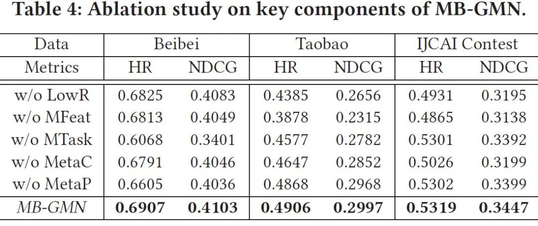 为了验证 MB-GMN 各个子模块的有效性,我们对整个模型框架中的可信模块进行了消融实验。相应的实验结果请参见 Table 4。在消融实验中,w/o 代表去除特定模块,LowR 指第一个模块中的低秩参数矩阵分解,MFeat 指第二个模块中综合所有交互类别的图卷积网络分支,MTask 指第三个模块的多任务学习,MetaC 指第一个模块中的元学习器,MetaP 指第三个模块中预测时的元学习器。从结果可以看出,各个模块在整个 MB-GMN 框架的推荐效果均有一定的促进作用。