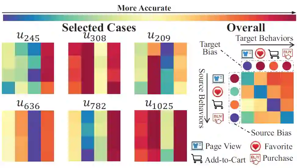 更具挑战的是,对不同用户来说,上述行为异构性常常有所差别,例如有的用户倾向于浏览商品后直接决定是否购买,而有的用户习惯将候选商品添加购物车后统一购买。因此,如果对用户多行为交互模型进行有效地个性化建模,将是该工作所面临的重要挑战。