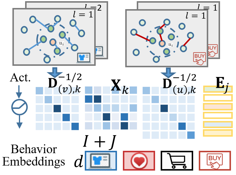 得到上述定制化的用户和商品的表征之后,MB-GMN 基于各个行为类别的邻接矩阵,分别进行 L 次基于图卷积的消息传递操作,以利用历史交互记录对用户和商品的表征进行平滑。在推荐场景中,当有 K 个行为类别时,将得到 K 个只与单个行为相关的平滑的用户与商品的表征信息。在图卷积网络中,MB-GMN 使用点的度矩阵进行 normalization,并采用 LeakyReLU 激活函数。