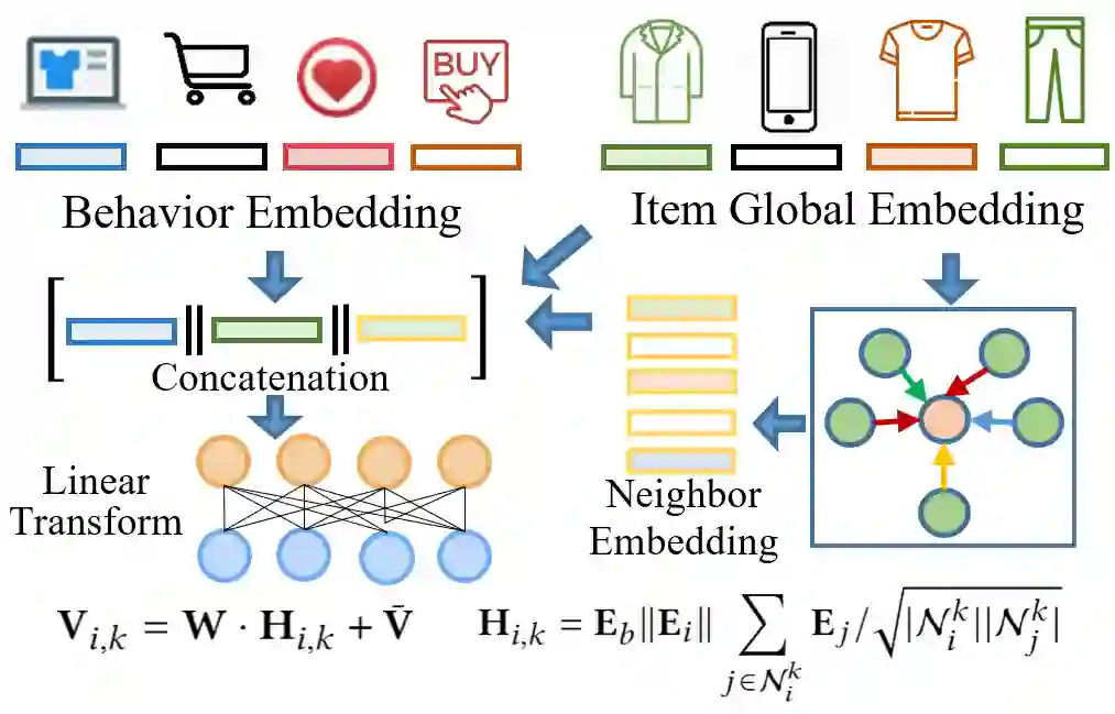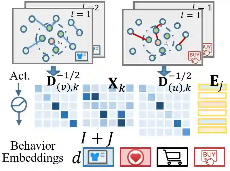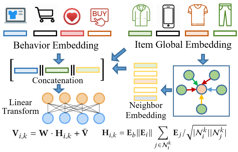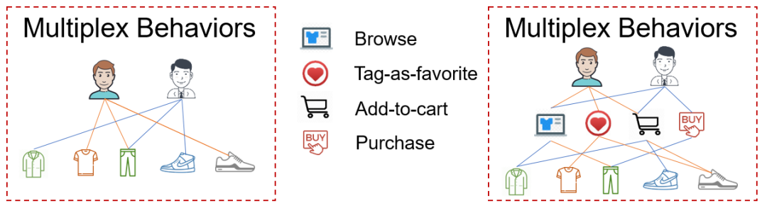 近年来,基于图神经网络的深度学习模型的引入给协同推荐方法带来了明显的效果提升。但是,现有的方法大多只针对单类别的用户与商品的交互关系(如点击、购买)进行建模,而忽略了推荐场景中用户多行为的特性。例如,在一个典型的电商平台上,同一个用户和商品的交互关系可能会是多重类别的,其中包括浏览、加购物车、收藏、购买等多种交互关系,不同交互行为赋予了用户和商品之前关联性不同的语义信息,从而可以使得对用户。