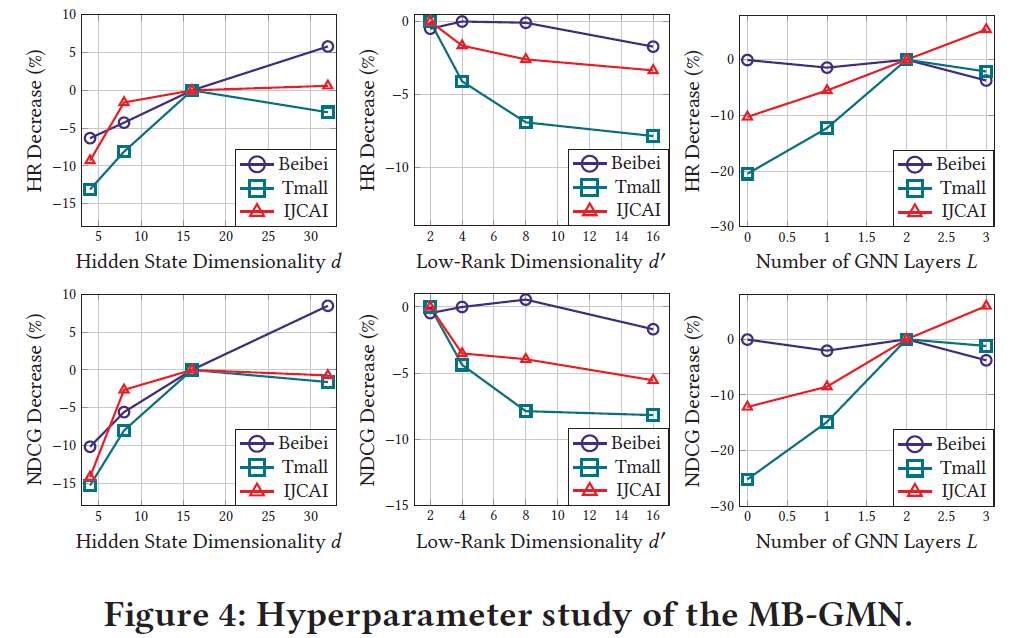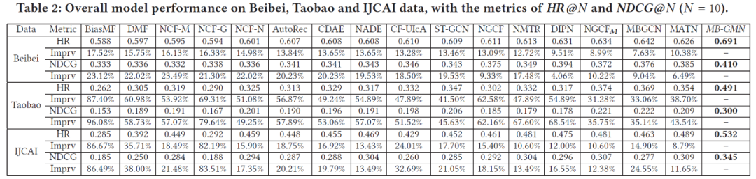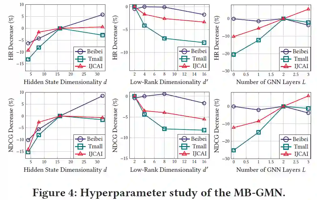如 Table 2 所示,在三个数据集上 MB-GMN 均取得了明显更优的推荐效果。同时我们观测到,考虑用户多种行为类别的方法,如 MATN、MBGCN 取得了优于普通协同过滤方法的效果。