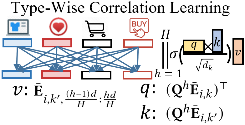 除了分别使用不同行为类别的邻接矩阵,为了综合提取用户/商品的交互特征,MB-GMN 也将所有行为数据汇聚构建为一个异构图,另外进行一组异构图卷积特征提取。在每次异构图卷积迭代时,MB-GMN 首先进行一次上述同构图卷积操作,得到各个行为类别的平滑特征,再应用多头自注意力机制计算各个行为之间的相关性,最后使用相关性矩阵,对各个行为的表示向量进行修正与更新,从而得到综合考虑了不同行为信息的用户与商品的表征信息。