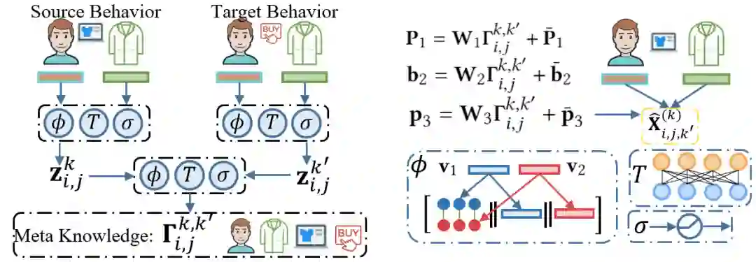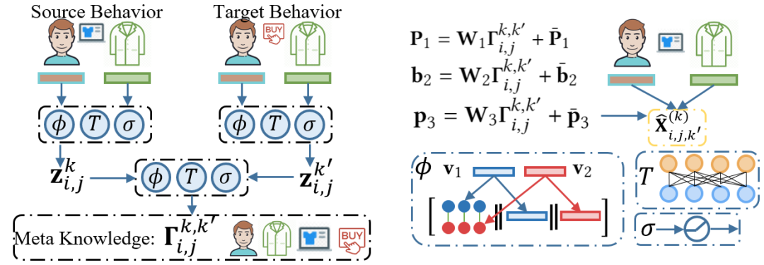 为了在上述过程中更好地提取不同行为间的语义迁移关系,MB-GMN 应用一个元学习器来提取特定行为下用户和商品的信息,以及源行为类别和目标行为类别之间的关系。