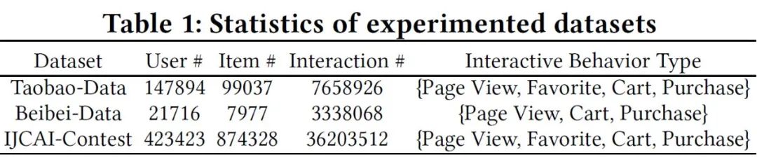 本文在三个多行为推荐数据集上进行实验与模型的验证,数据集均采集自真实的大规模电商平台,统计信息见 Table 1。本文采用隐式反馈任务常用的 leave-one-out 评测模式,对每个测试用户,选取最后一个购买商品作为测试集中的正例,另选取 99 个未交互商品作为测试负例,使用 Hit Rate@N 和 NDCG@N 作为评测指标。我们将 MB-GMN 与 6 个类别的 14 个 baseline 方法进行了对比实验,并且展示了模型在推荐任务上的优势。