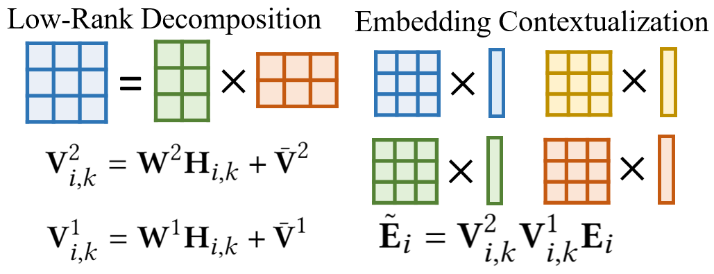 这里,为了防止定制化过程过于复杂,使模型训练出现过拟合,MB-GMN 不直接生成定制化所需的变换矩阵,而是生成两个低秩的分解矩阵,使用两次低秩矩阵乘法完成一次变换操作。其具体的分解优化操作如下图所示: